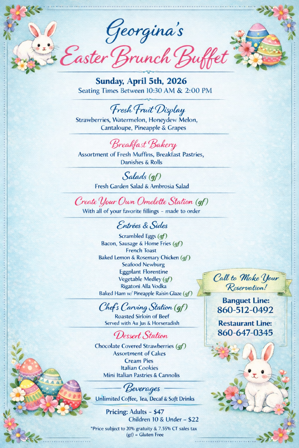 Welcome to Georgina’s Restaurant in Bolton CT. We have been serving up Italian inspired cuisine to Bolton, Manchester, South Windsor, Vernon and all surrounding areas since 1992. To truly appreciate our restaurant come with your family and appetite! We offer pizza, Italian entrees, grinders, burgers, gyros, pasta dishes, as well as items off our grill. Georgina’s Italian Restaurant has a full bar, ample parking, and friendly service to ensure your dining experience is simple, relaxing and enjoyable. We have a reputation for preparing delicious